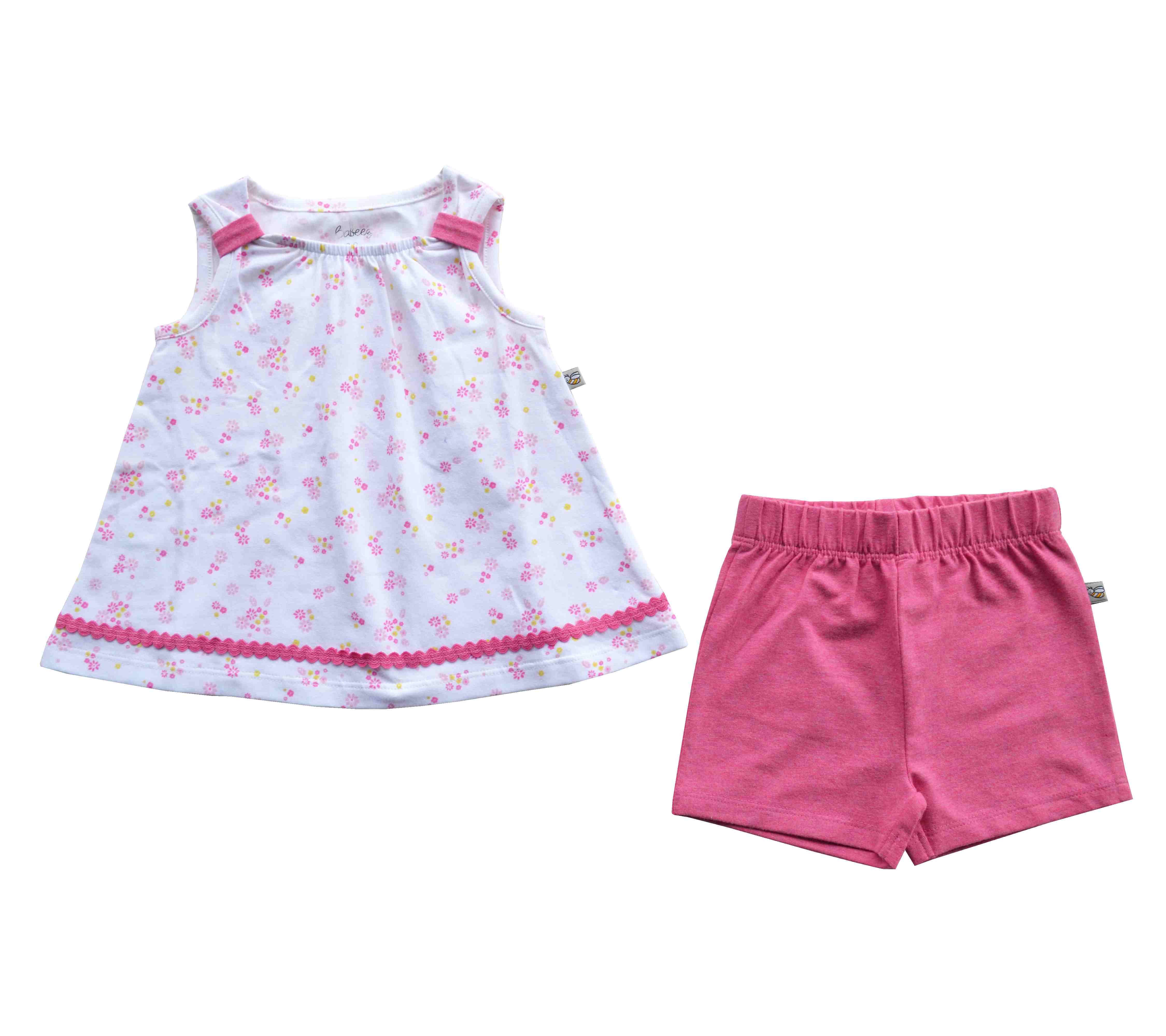 Allover Flower Printed White Top + Pink Shorty Set (95% Cotton 5% Elasthan Jersey)