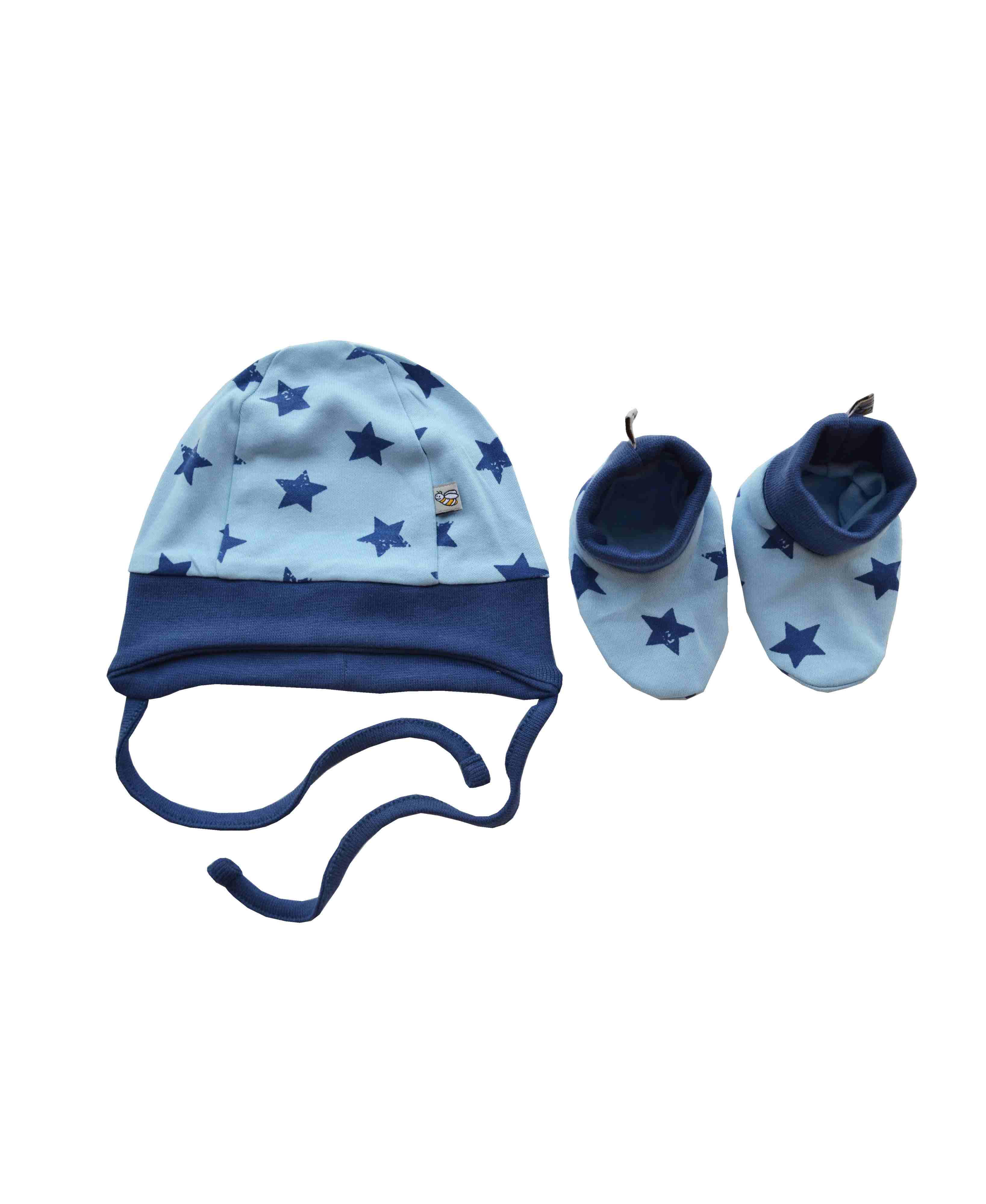 Allover Star Print On Blue Cap + Booties (100% Cotton Interlock Biowash)