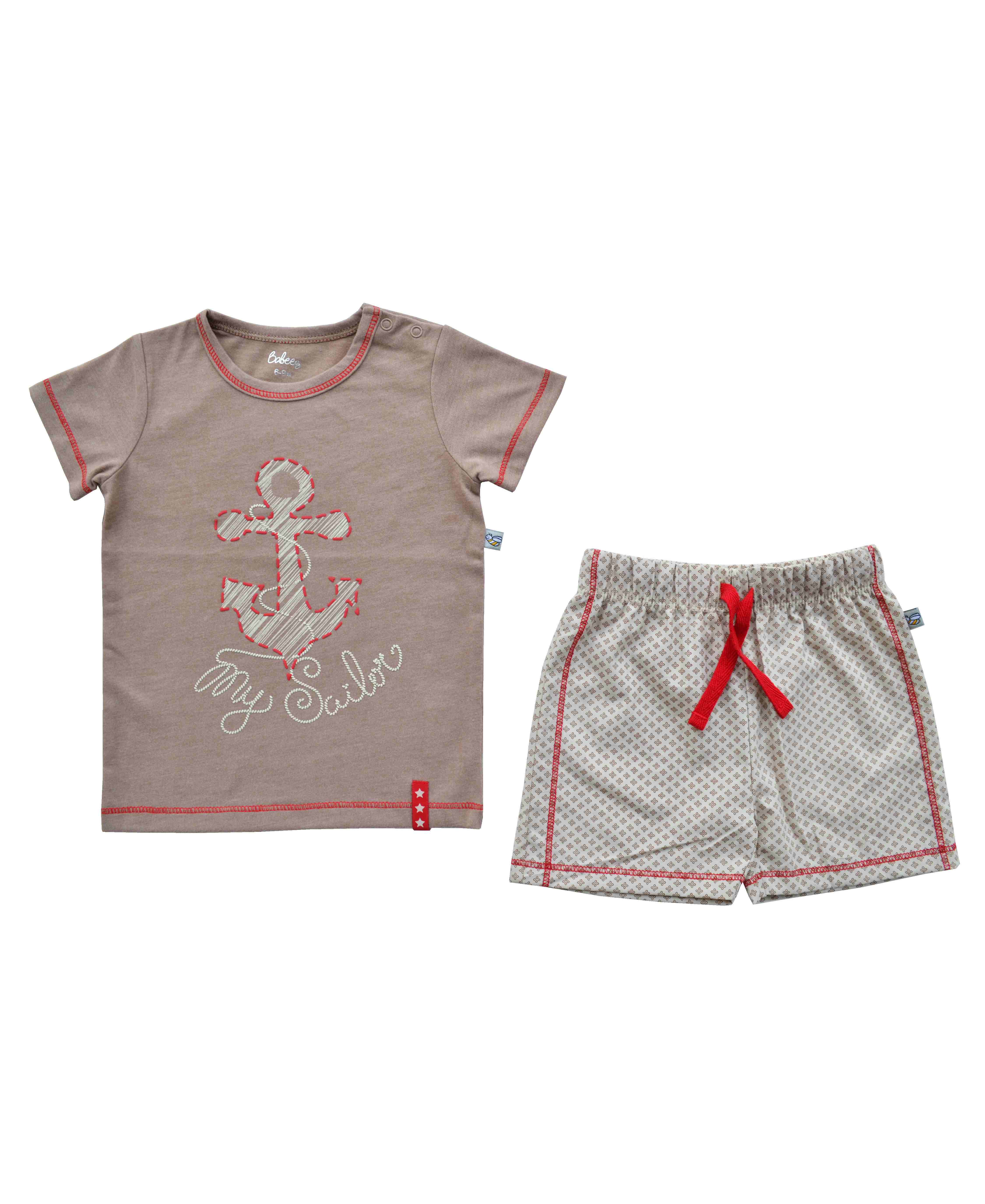 Brown Anchor Print T-Shirt + White Allover Printed Shorty Set (100% Cotton Jersey)