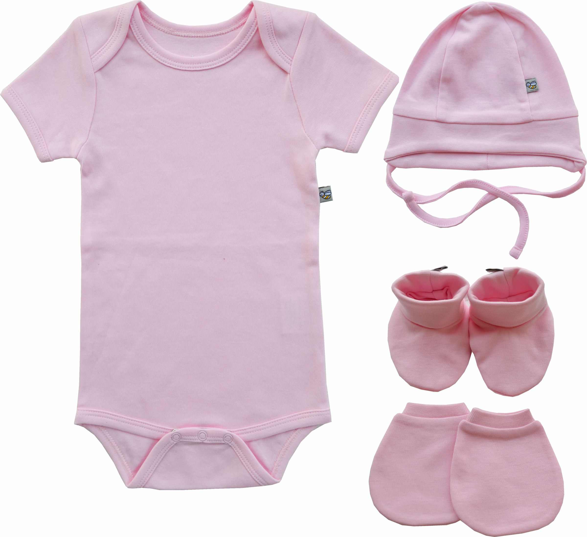 Pink Baby Romper/Onesie+Pink Cap+Pink Mitten bootie set (100% Cotton)