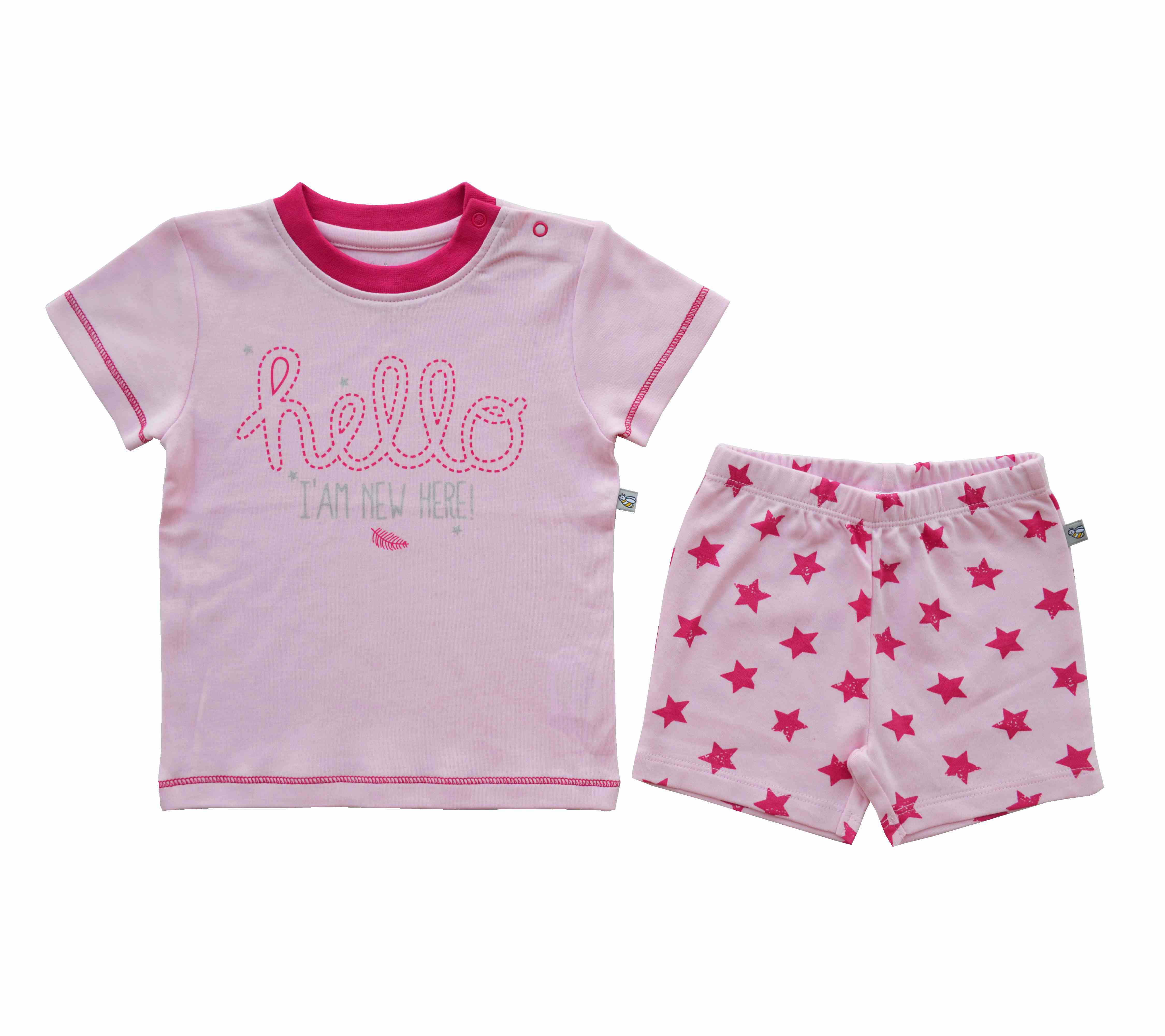 Pink Hello Print T-Shirt + Allover Star Print Shorty Set (100% Cotton Interlock Biowash)