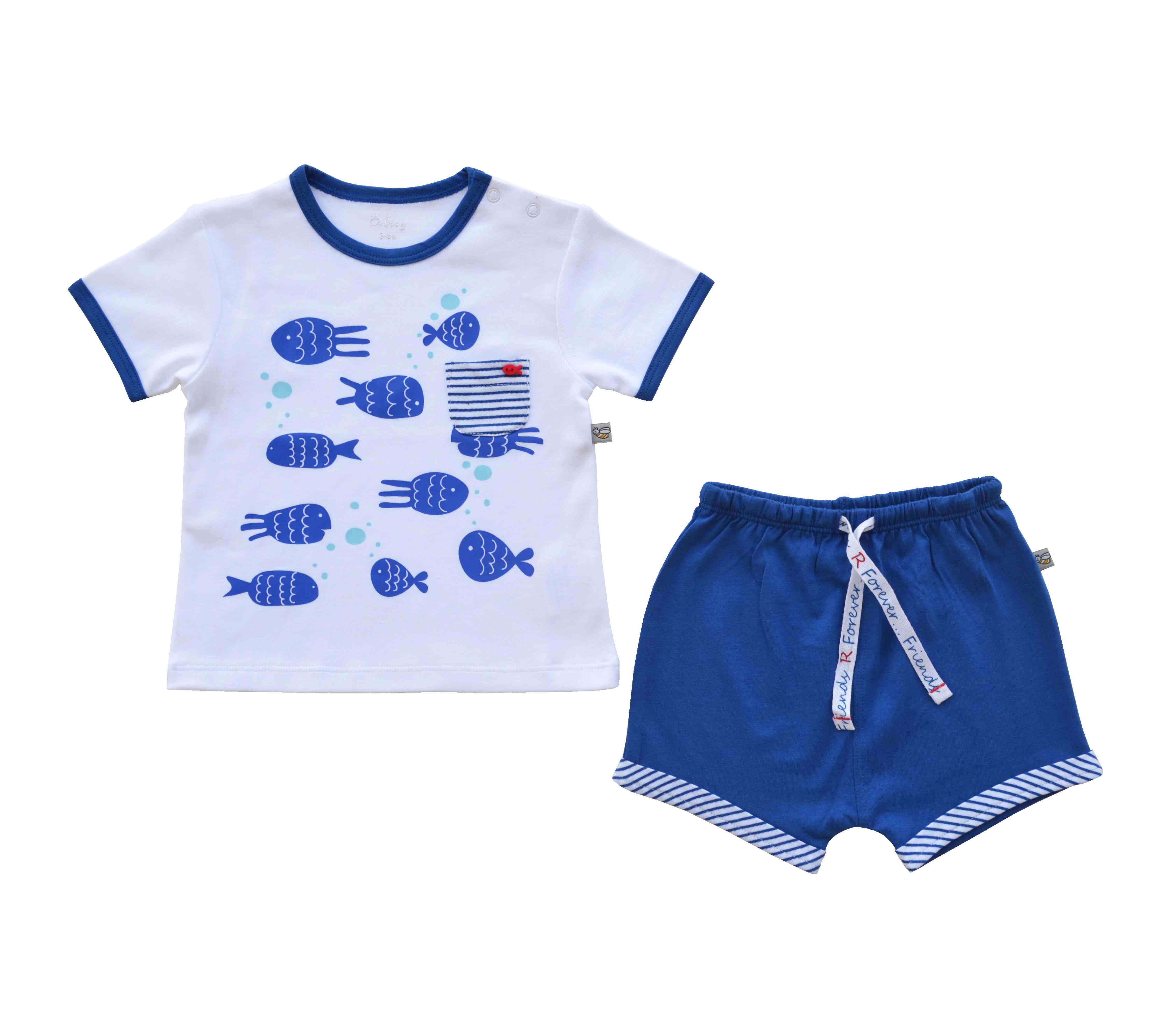 White Fish Print T-Shirt + Blue Shorty Set (100% Cotton Jersey)